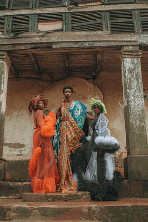 Baba suwe and his two wives in front of their family home . Dressed in beauty Ankara regalia . Grainy image .
